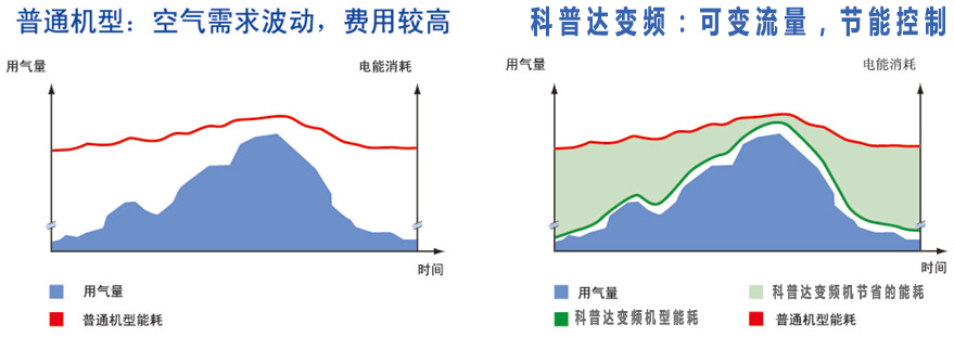 科普達(dá)技術(shù)領(lǐng)先的科普達(dá)變頻空氣壓縮機(jī) 可以精確地滿足用戶的空氣需求。當(dāng)用戶的用氣量降低時(shí),轉(zhuǎn)速調(diào)低,排氣量相應(yīng)減小,同時(shí)能耗也按比例下降。通過先進(jìn)的變頻技術(shù),大大減少了空壓機(jī)的卸載,使能耗大大下降。